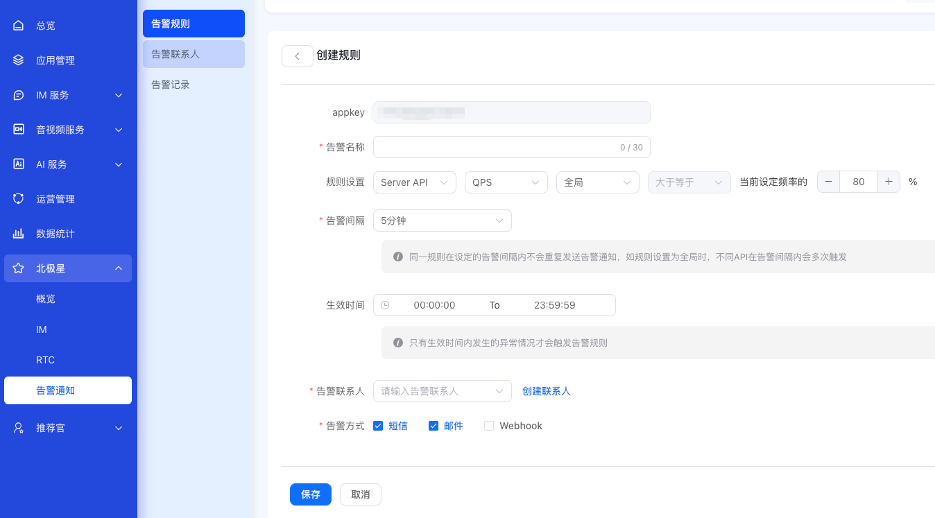 北极星告警通知服务为开发者提供基于告警规则的告警服务,通过短信及邮件的方式通知客户融云 IM 及 RTC 服务的异常指标和事件,开发者可基于告警内容及时采取应对措施。