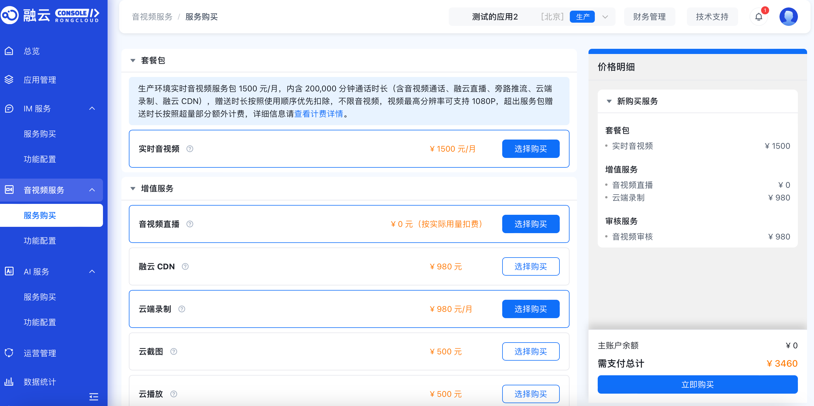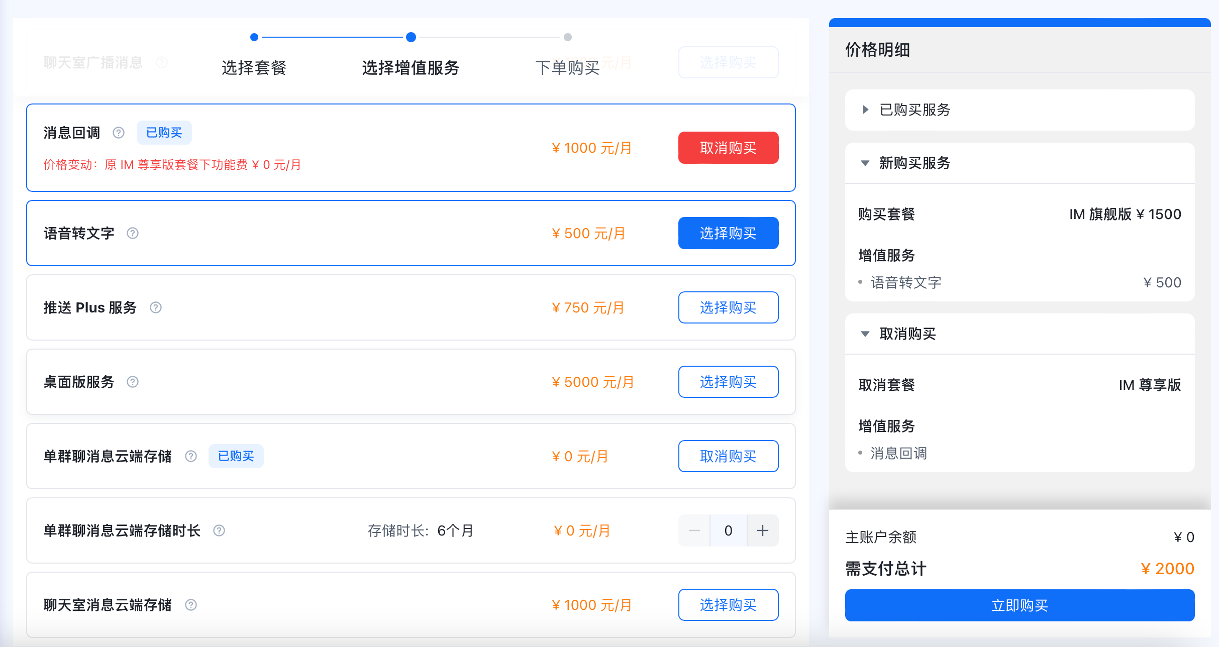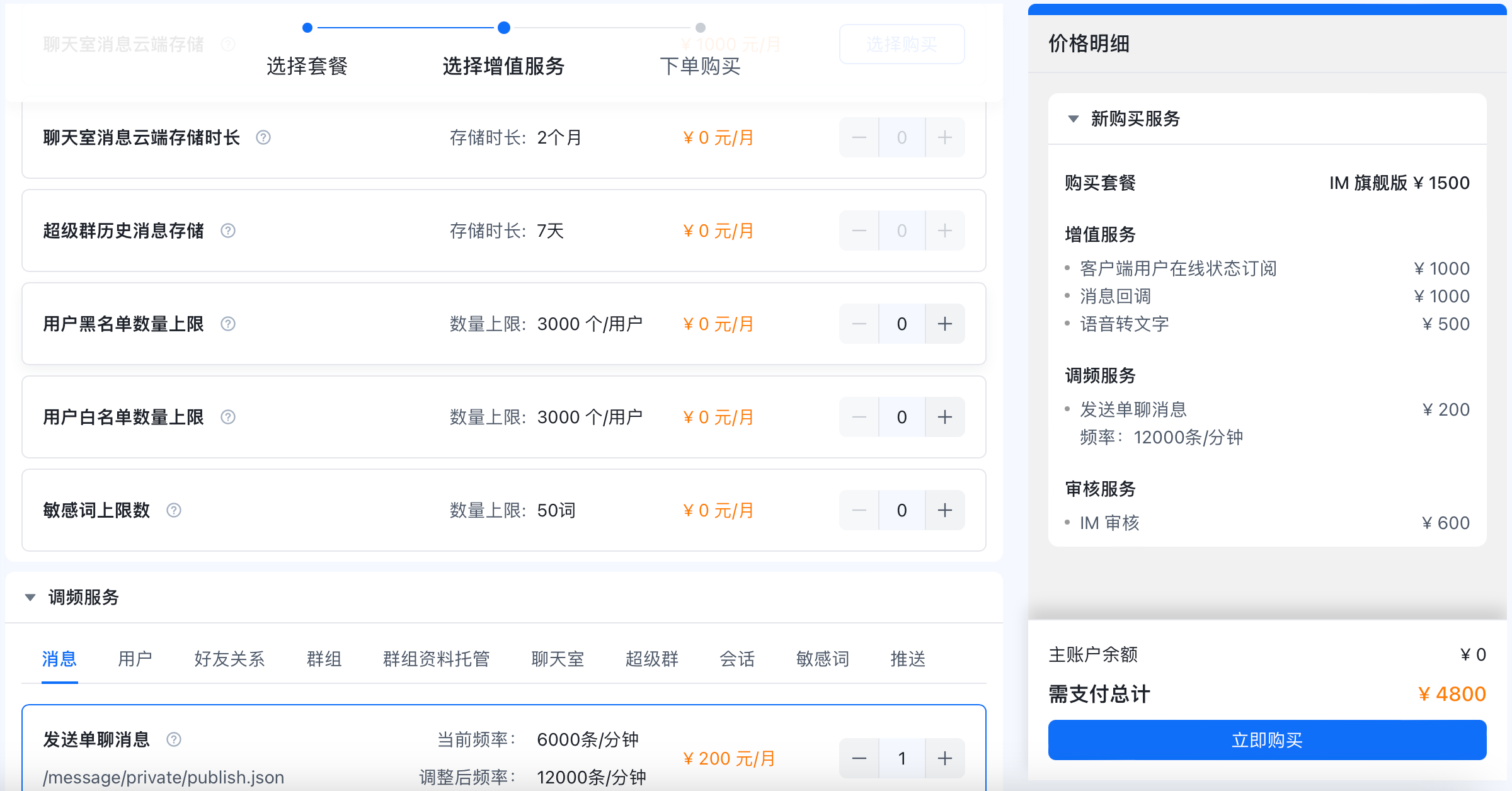 在“IM 服务 - 服务购买”中,统一购买 IM 套餐及 IM 增值服务,包括接口调用频率调整、审核服务等;选择需要购买的服务后,统一付费下单。