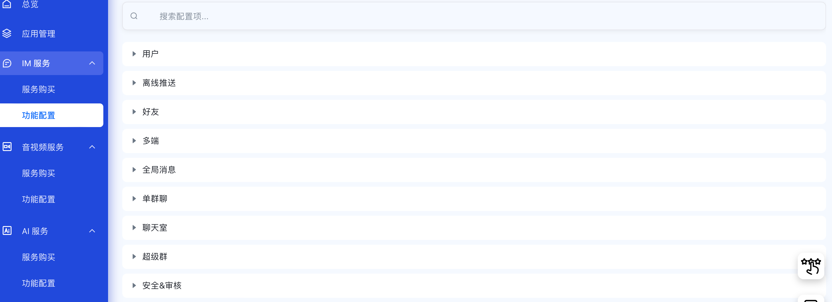 按服务分类(IM、音视频、AI),不同服务的功能配置全部聚合到对应服务的“功能配置”页面中。