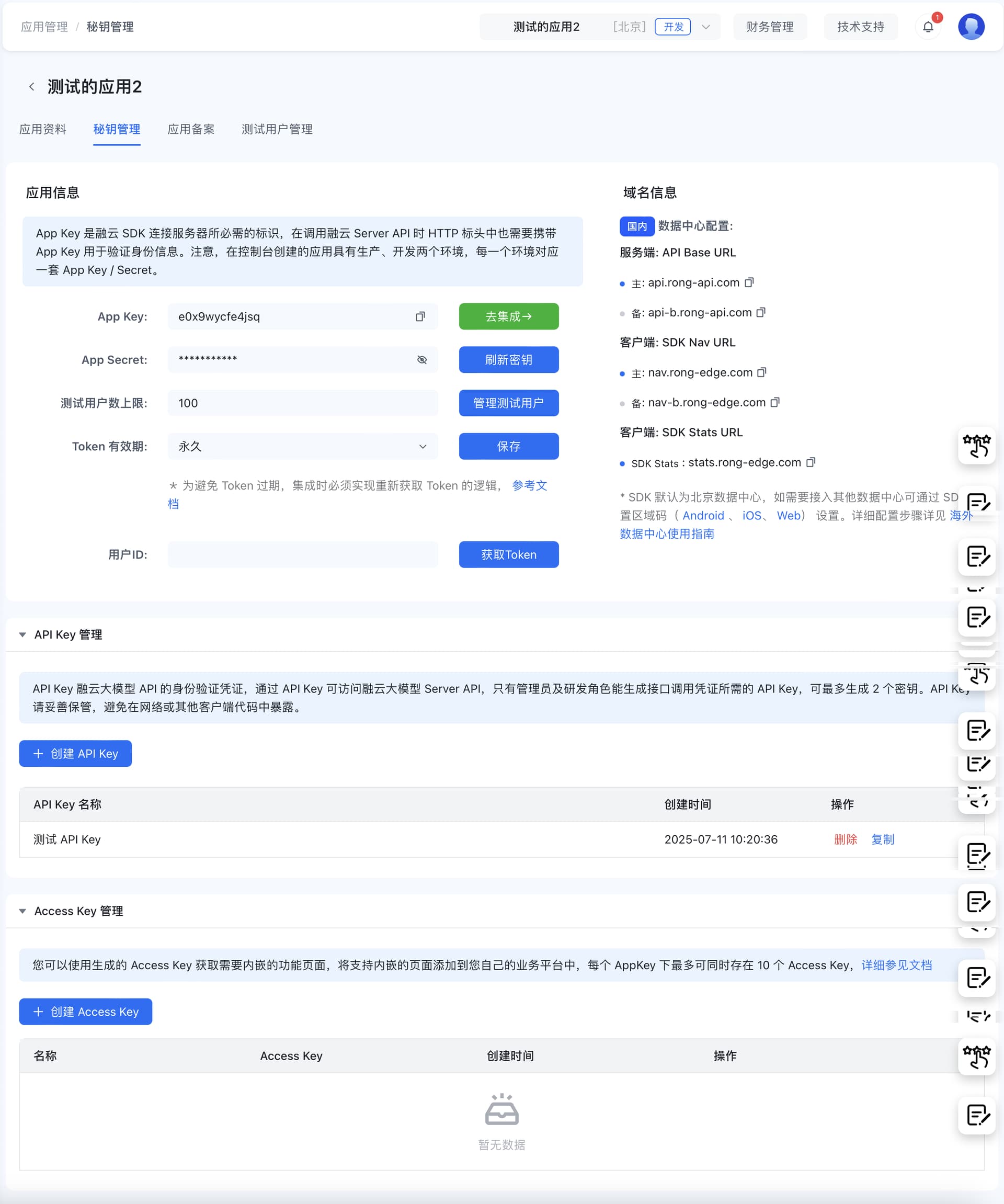 API Key:融云大模型 API 的身份验证凭证,通过 API Key 可访问融云大模型 Server API