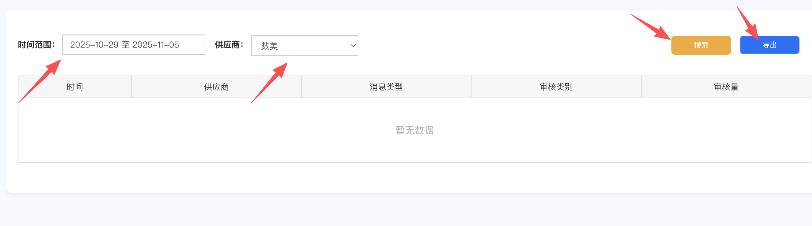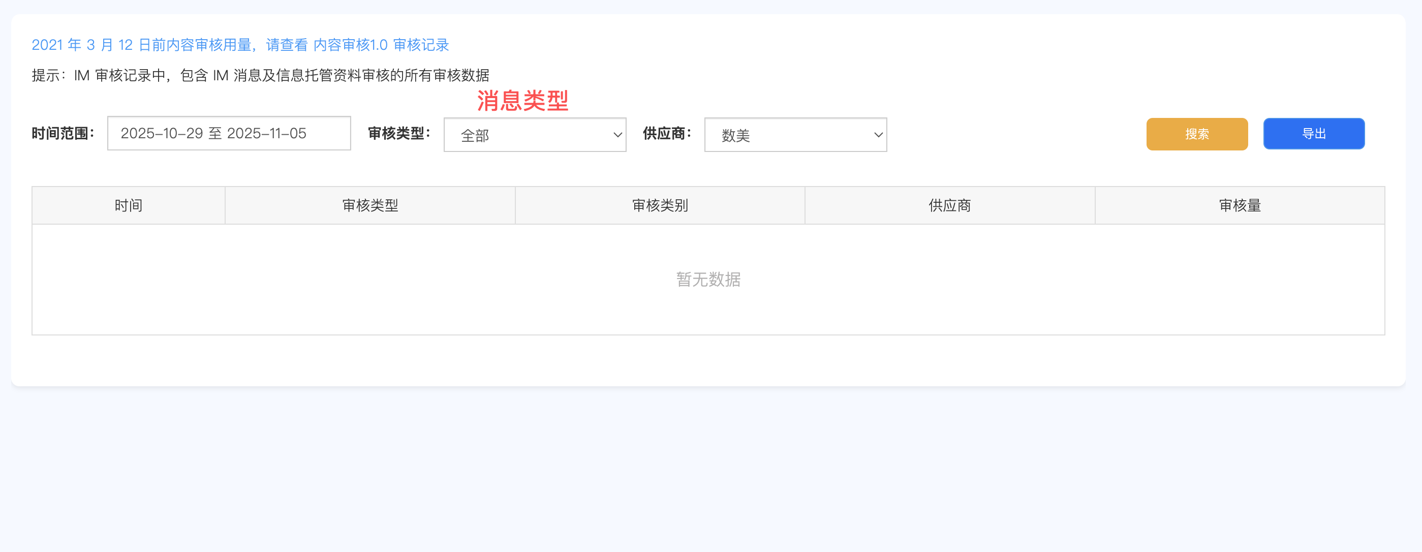 该页面支持按时间范围、消息类型以及供应商查询和导出审核用量。