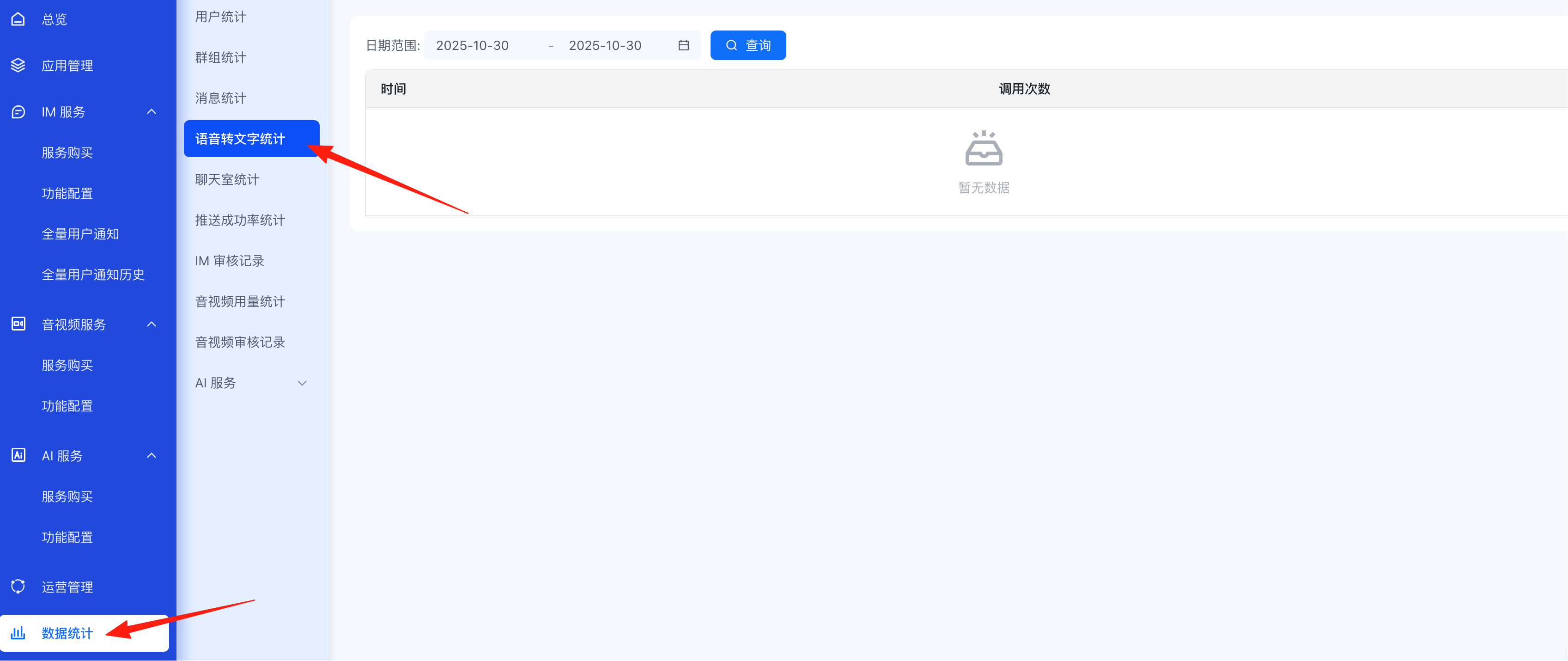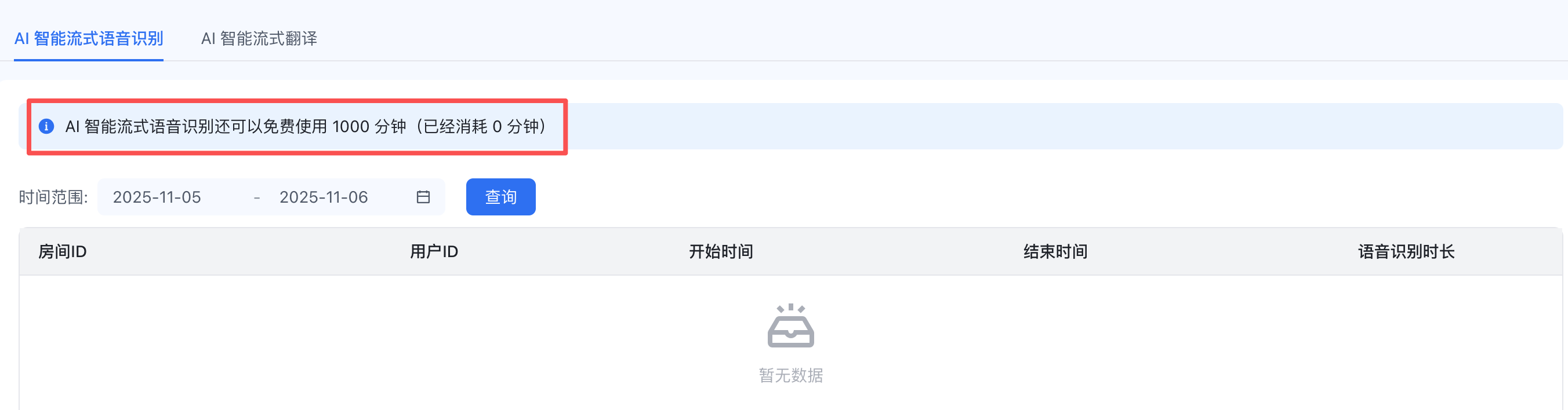 该页面支持按时间范围查询房间ID、用户ID、开始时间、结束时间、语音识别时长。