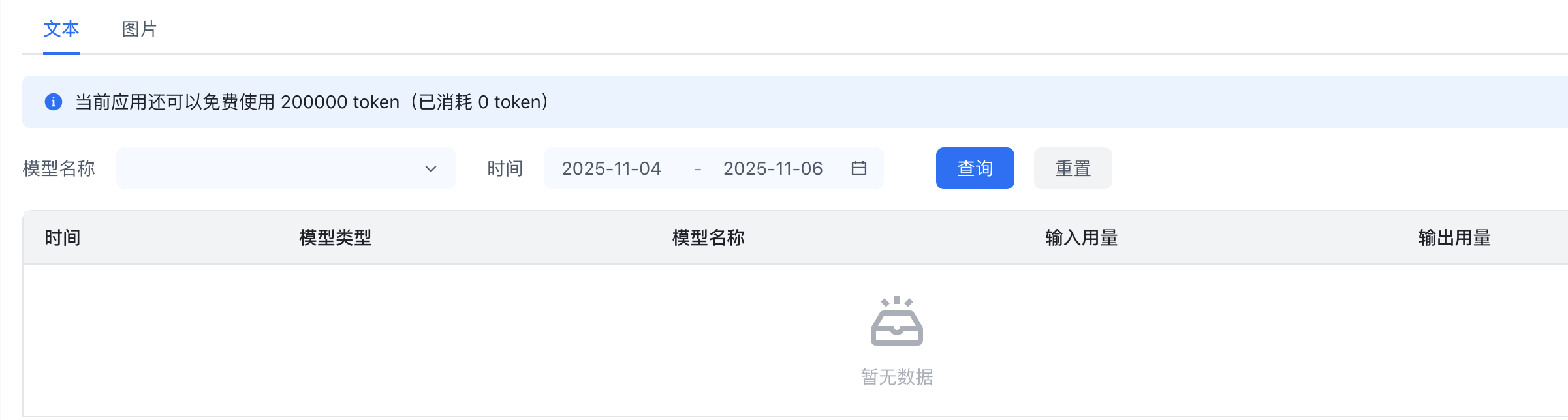 该页面支持按时间范围分别查询文本和图片的模型类型、模型名称和用量。