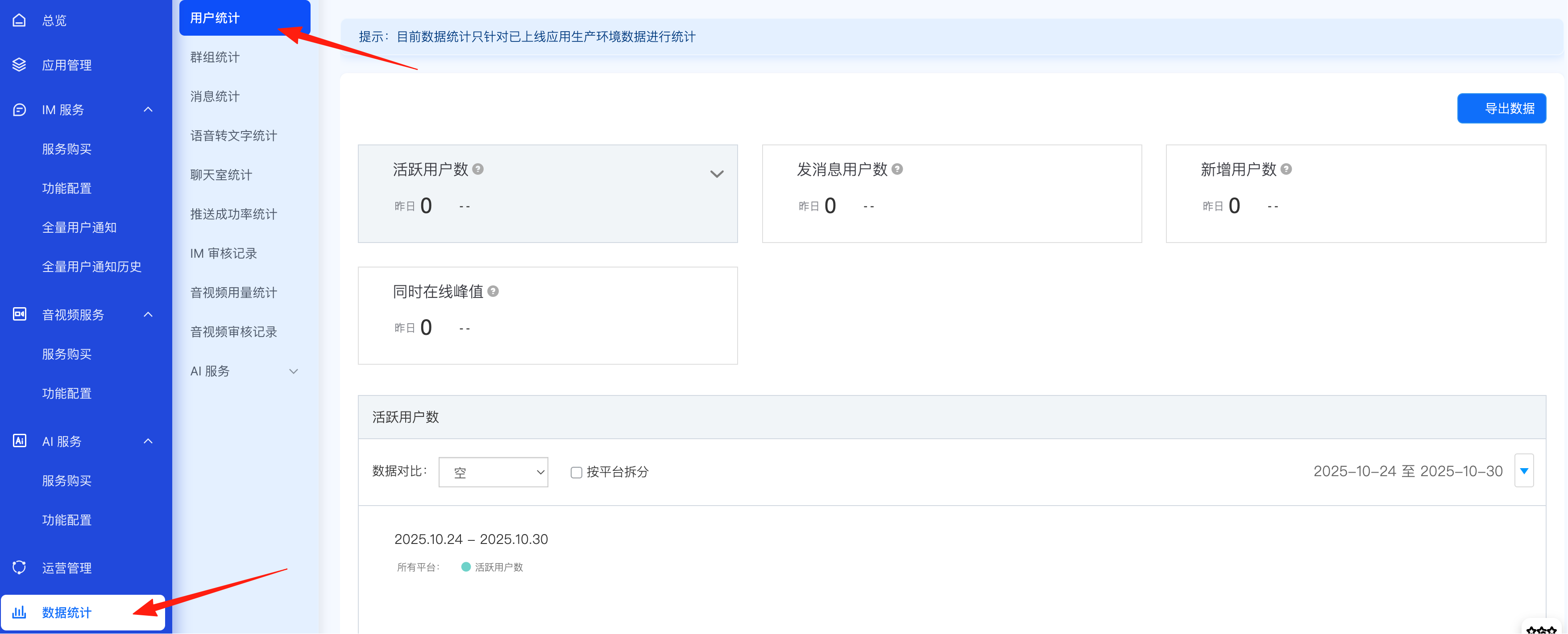 统计说明: 支持单聊、群聊、聊天室、超级群、系统消息会话的消息统计,内含消息的上行、下行、分发、Push 等详细说明。