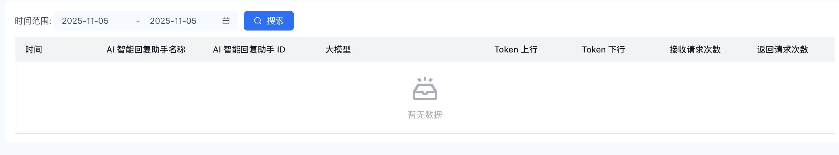 该页面支持按时间范围查询 AI 智能回复助手名称、AI 智能回复助手 ID、大模型、Token 上行、Token 下行、接收请求次数、返回请求次数。