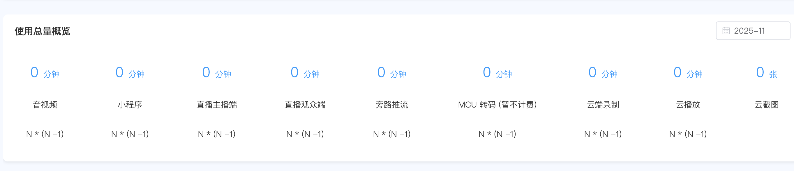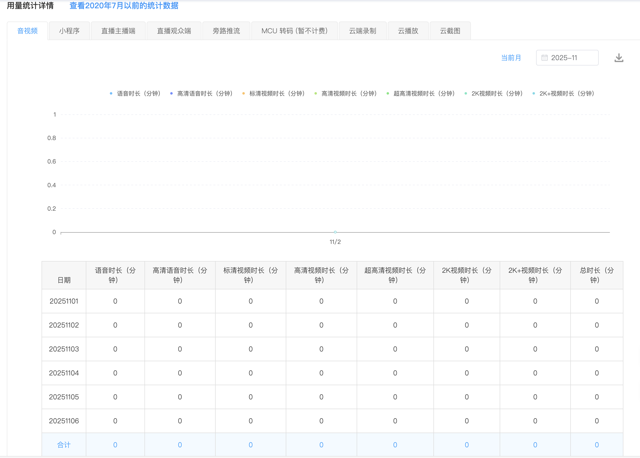 该页面提供【使用总量概览】、【 用量统计详情】两部分数据,支持查询音视频、小程序、直播主播端、直播观众端、旁路推流、MCU 转码、云端录制、云播放、云截图这些服务的音视频用量统计。