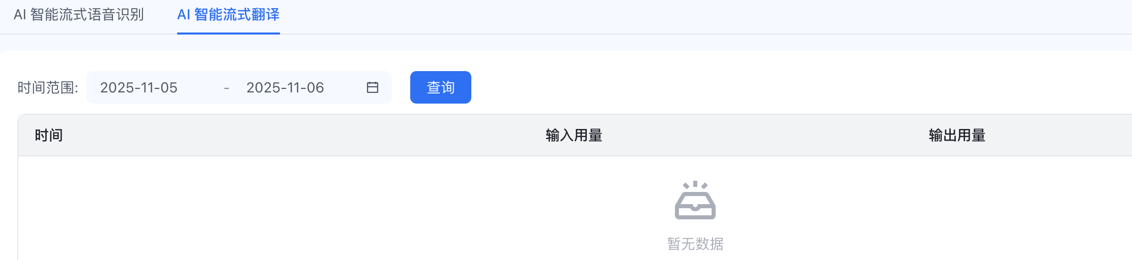 该页面提供 AI 智能语音(AI 智能流式语音识别和 AI 智能流式翻译)、AI 智能回复助手、大模型 API 以及翻译服务的用量查询。