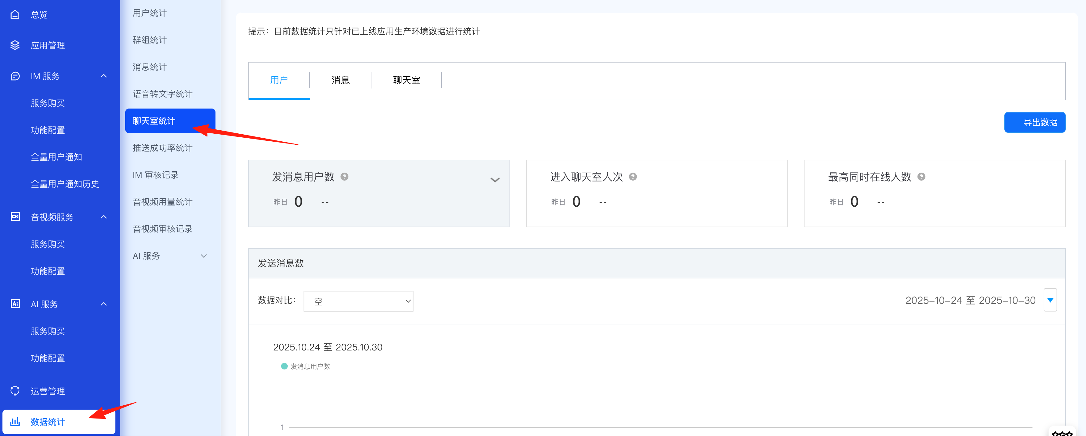 | 聊天室下行消息数 | 用户接收到的聊天室中消息数与主动获取聊天室历史消息数之和。 | |