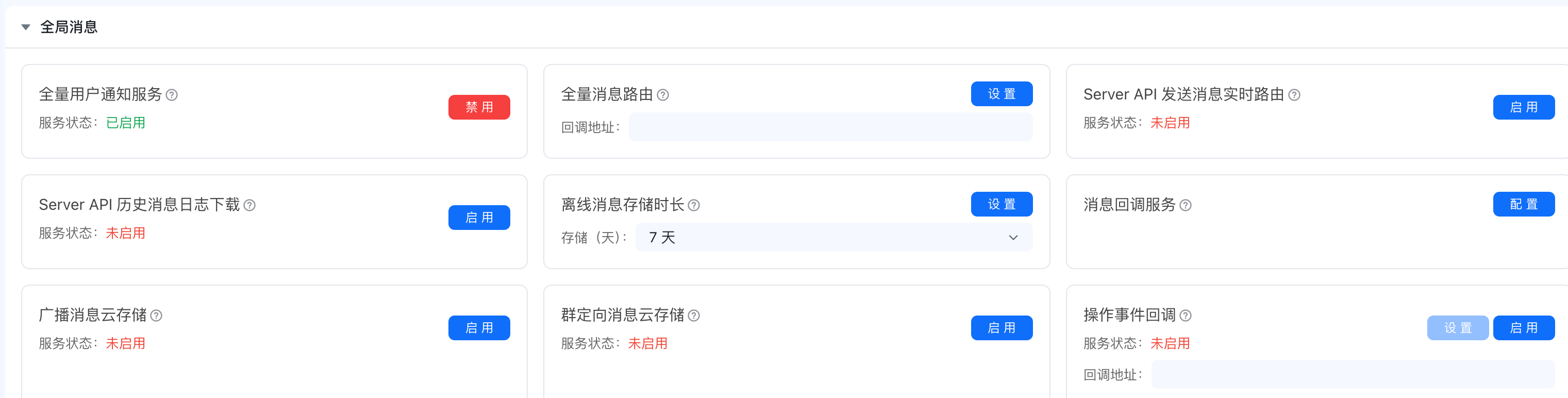 - 功能说明:开通单群聊消息云存储功能后,默认全量广播消息不会存储到历史消息中,如需要存储可开通此功能。