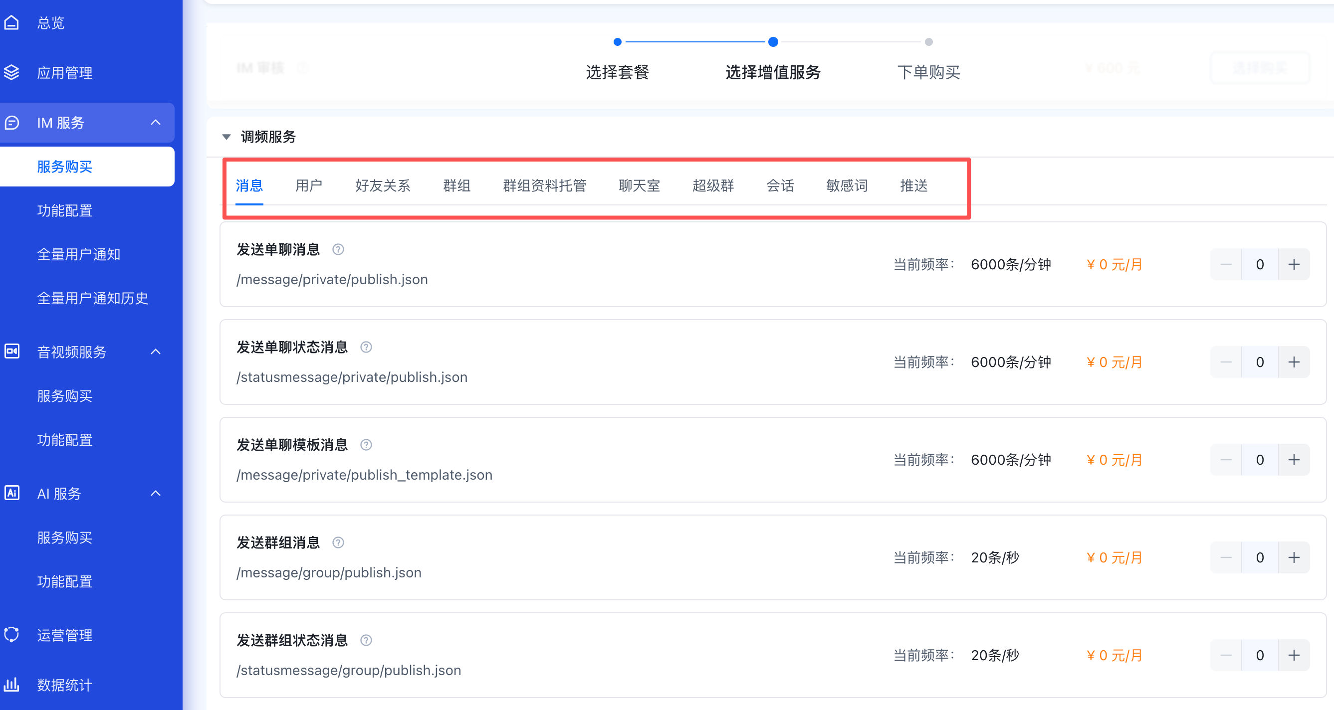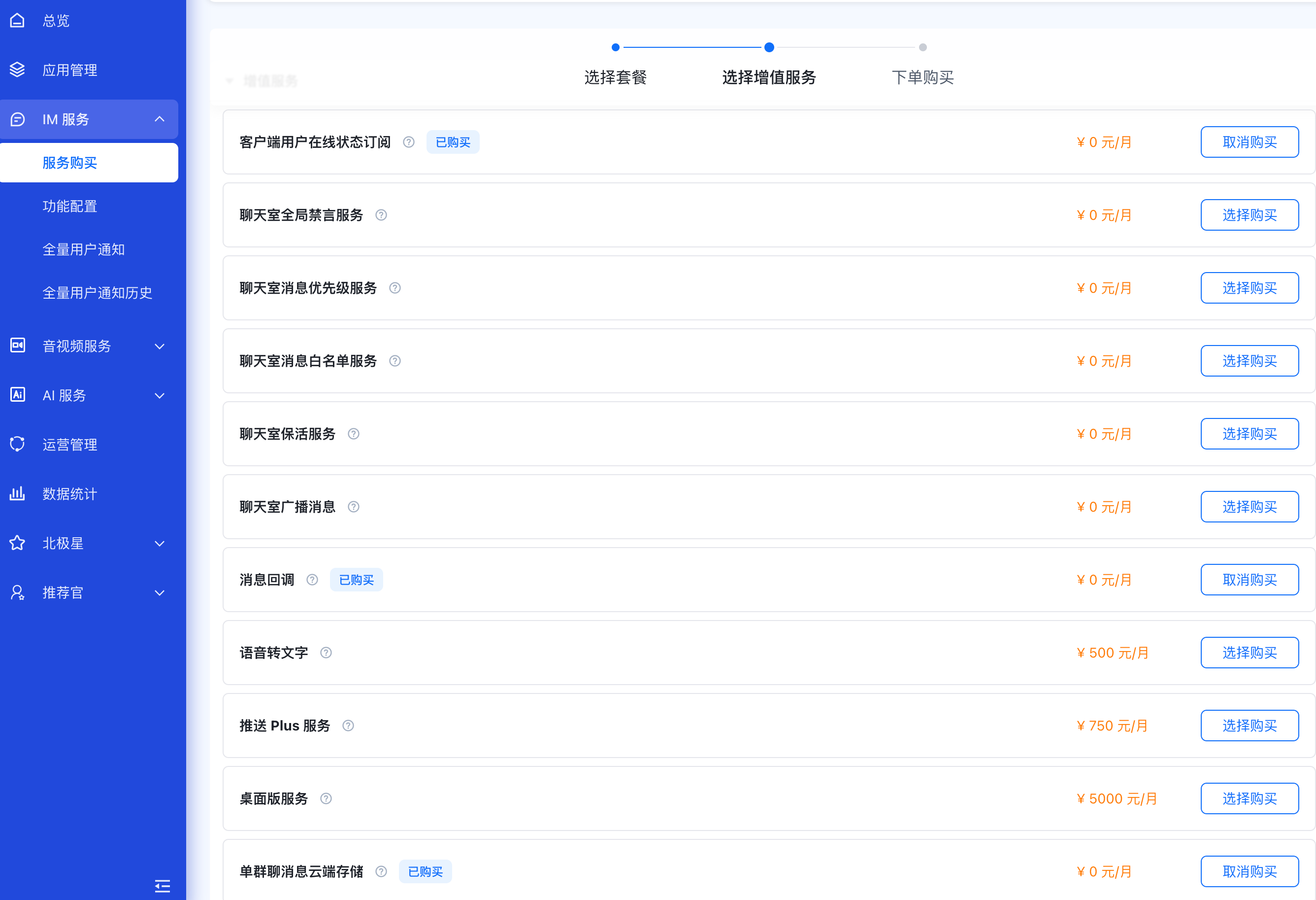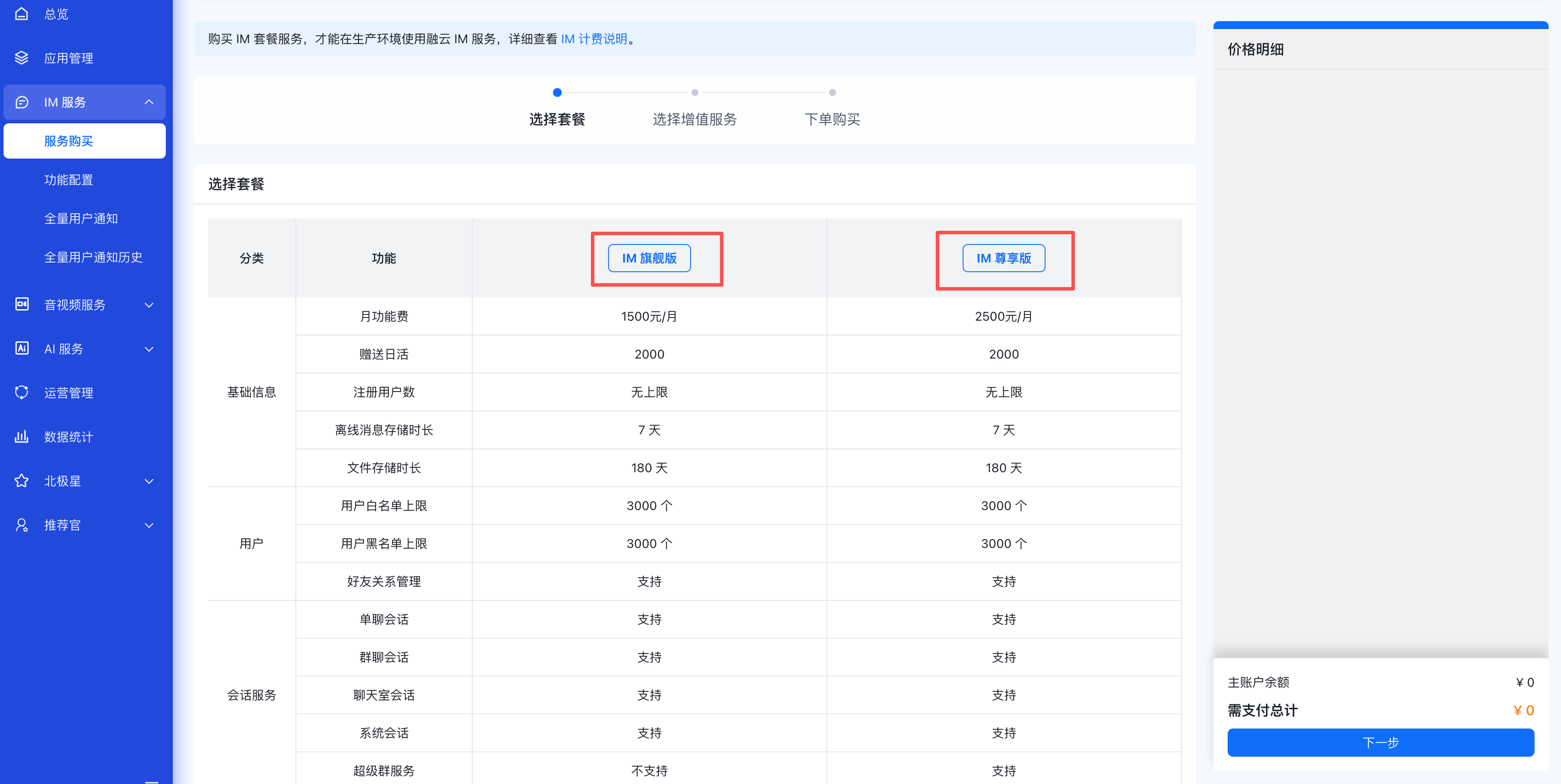 IM 服务分为旗舰版和尊享版,注意:数据中心不同对应的价格也不同,具体可参考截图位置查看。