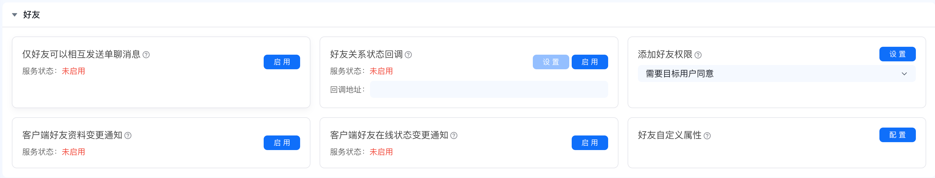 - 功能说明: 应用中有申请添加好友、同意&拒绝好友请求、添加好友成功、移除好友成功等好友相关的操作行为时,实时同步到您的应用服务器,功能开通后 15 分钟生效,查看开发文档。