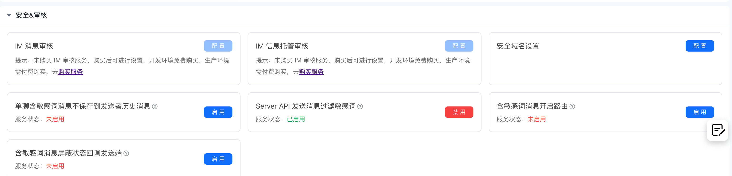 - 功能说明:默认 Server API 发送的消息不过审核,开启后,Server API 发送消息会过滤设置的敏感词、内容审核规则、以及消息回调服务设置的过滤规则。