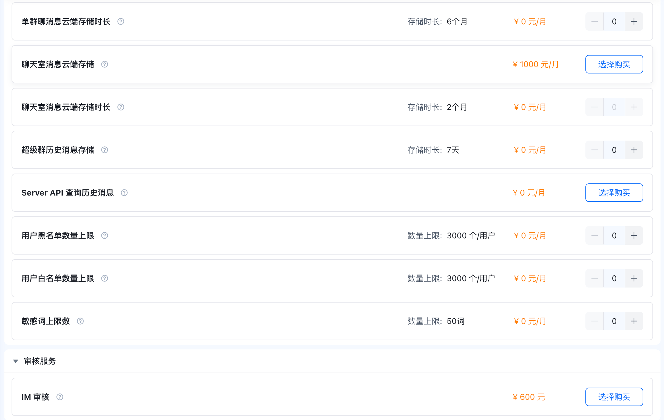 - 服务描述:聊天室消息云存储服务,购买后默认聊天室消息保存 2 个月。每增加 1 个月会产生额外费用。