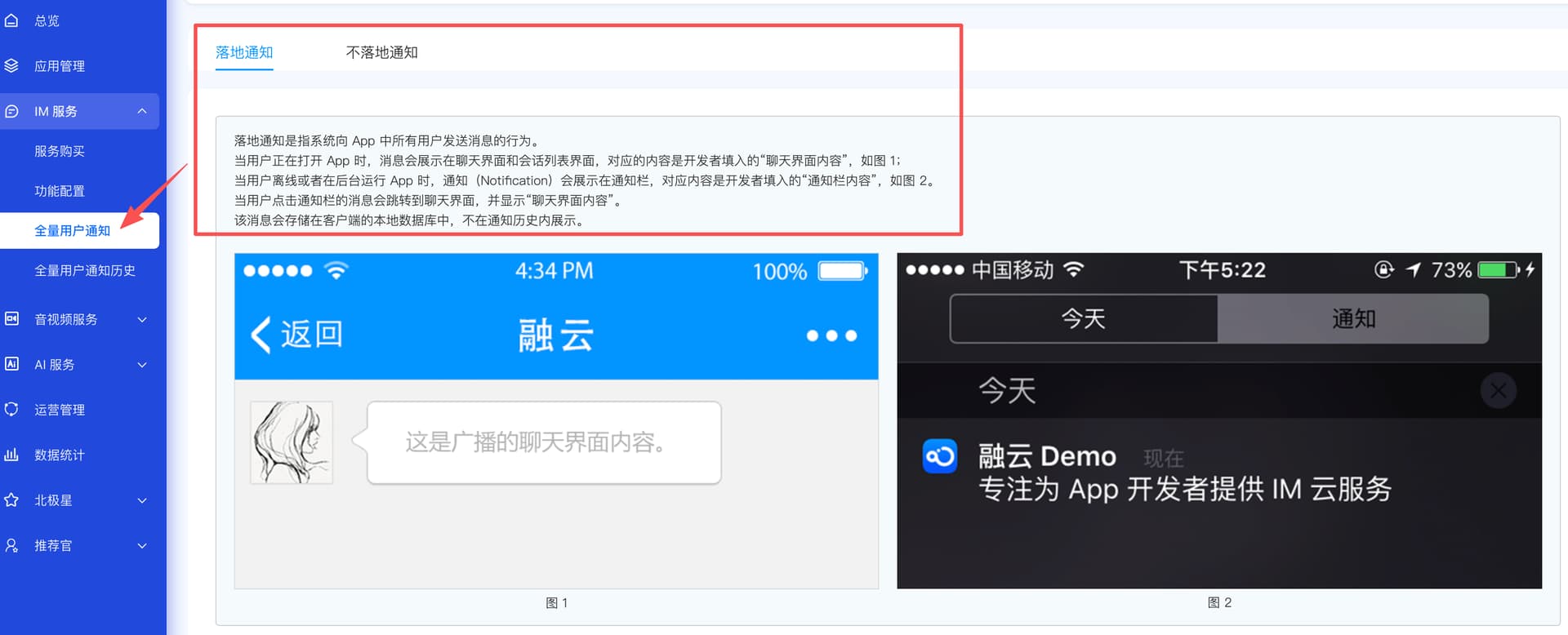 - 功能说明:默认新用户可以接收到注册之前 7 天内的广播消息,关闭后新用户不会接收到之前的全量用户落地通知。