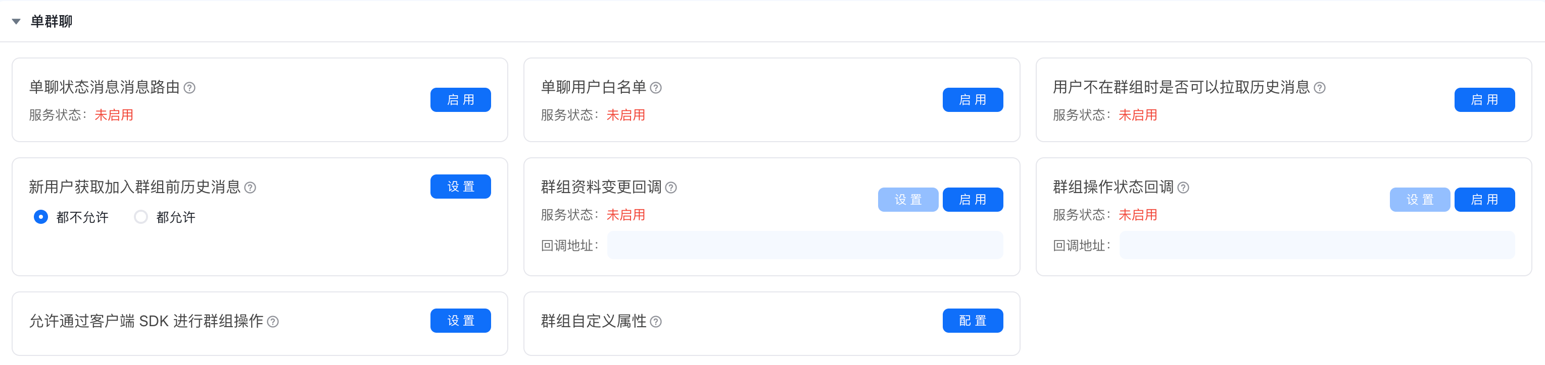 - 功能说明:默认用户不在群组中不能获取群组中的历史消息,开启后用户未在指定群组中时,也可以获取群组历史消息。