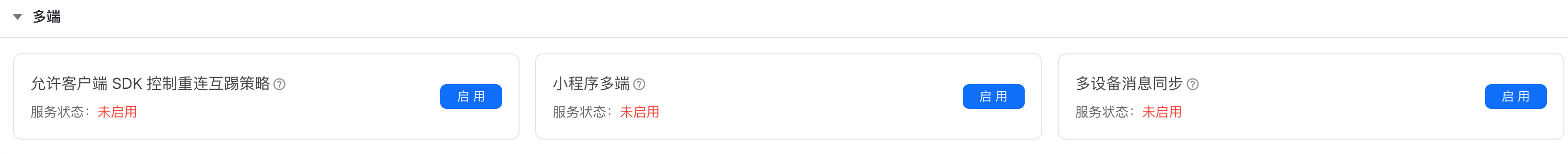 - 功能说明:默认融云小程序 SDK 仅支持一个端连接 IM 服务,如需要支持多端同时连接可开通此功能。