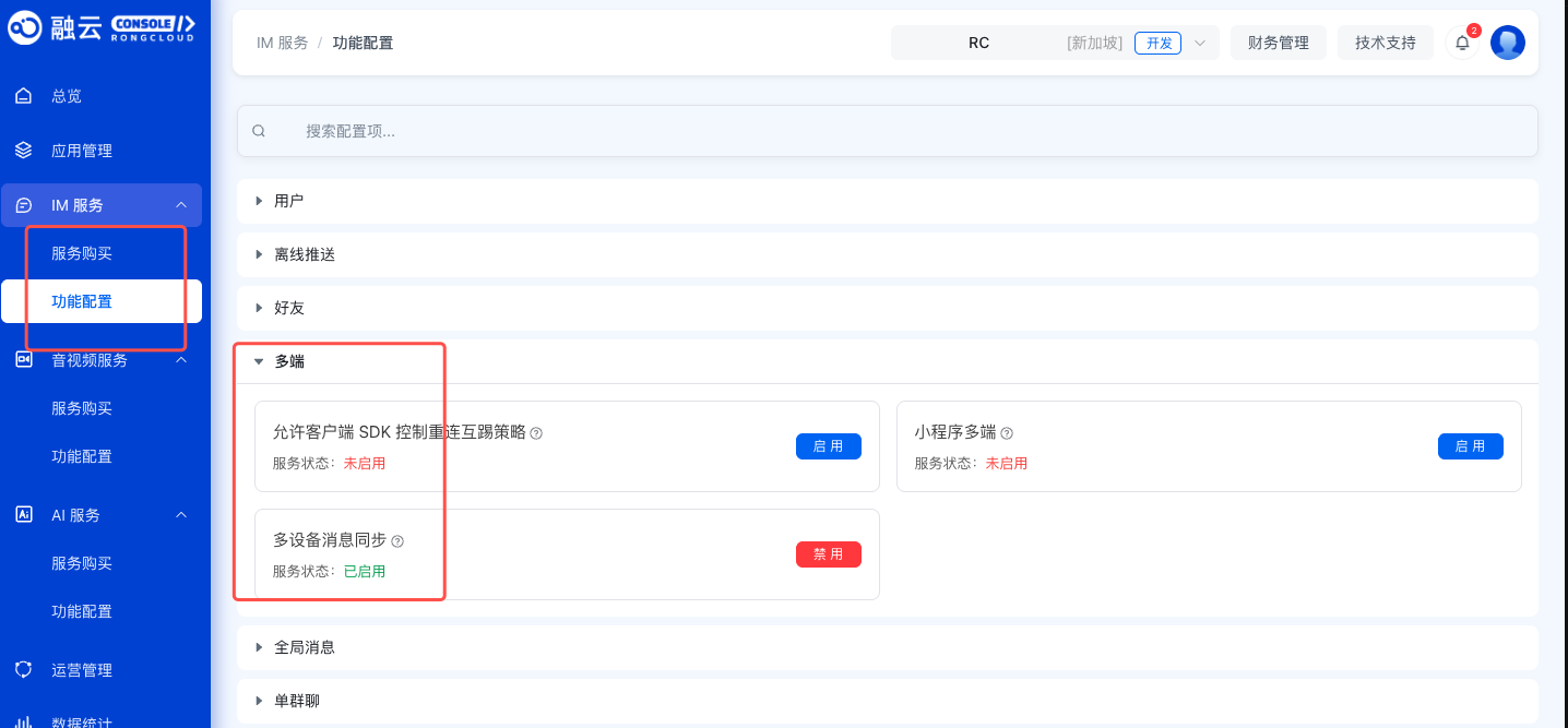 开通方式:进入融云控制台 – IM 服务 – 功能配置 - 多端 ,服务开通后 15 分钟左右生效,如下图: